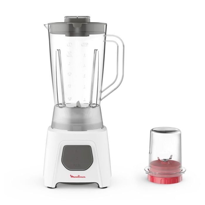 Blender MOULINEX - Puissance Moteur: 450 Watts - Capacité du Bol: 1.5 Litre - Nombre de vitesse: 1 Vitesse + Pulse - Bol plastique - Lames: en acier inoxydable - Anti-dérapants - Interrupteur de verrouillage de sécurité - Rangement du cordon - Système de nettoyage facile - Pièces compatibles au lave-vaisselle - Avec moulin à café - Couleur: Blanc - Garantie: 1 an