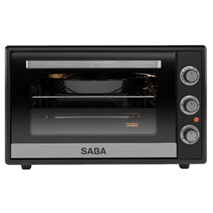 Four Électrique SABA - Volume: 70 Litres - Température Réglable - Minuterie: Mécanique jusqu'à 90min - Thermostat bimétallique - Panneau supérieur émaillé - Chaleur Tournante - Porte escamotable à 3 niveaux - Lampe - Poignée en aluminium - Double Vitre - Plateau rond (428 mm) + plateau carré + grille - Couleur: Noir - Garantie: 1 an